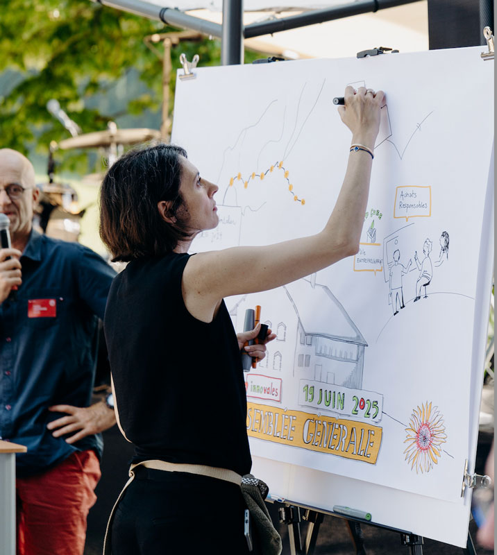 La restitution graphique consiste à réaliser un support visuel synthétique en captant et traduisant visuellement les éléments clés d’un contenu.